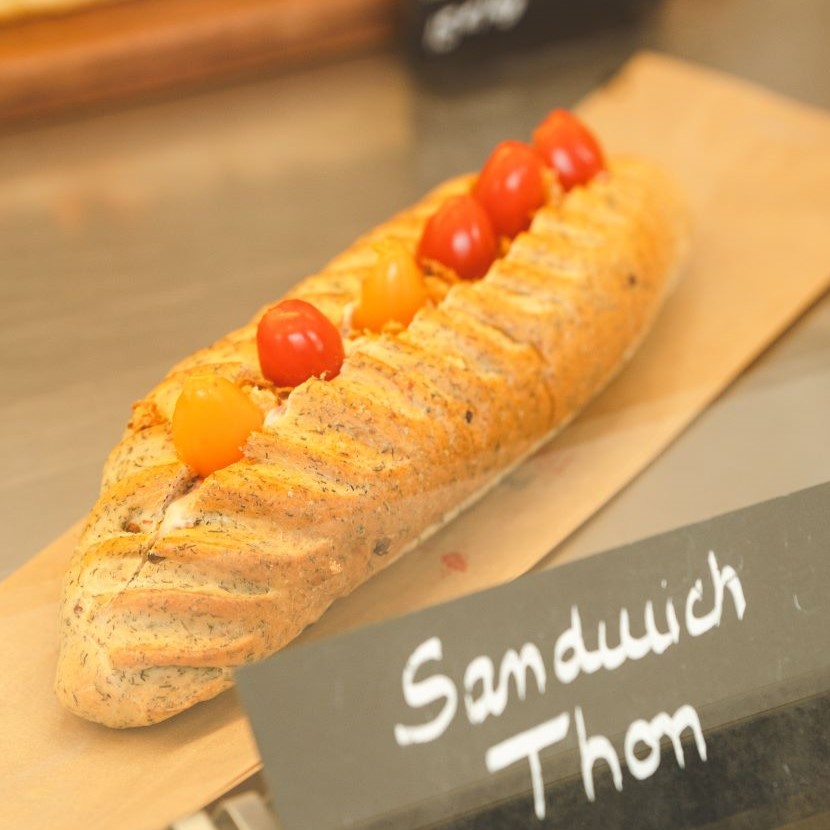 Pain viennois aneth et baies roses, thon, Philadelphia, oignons rouges, oignons frits, tomates cerises